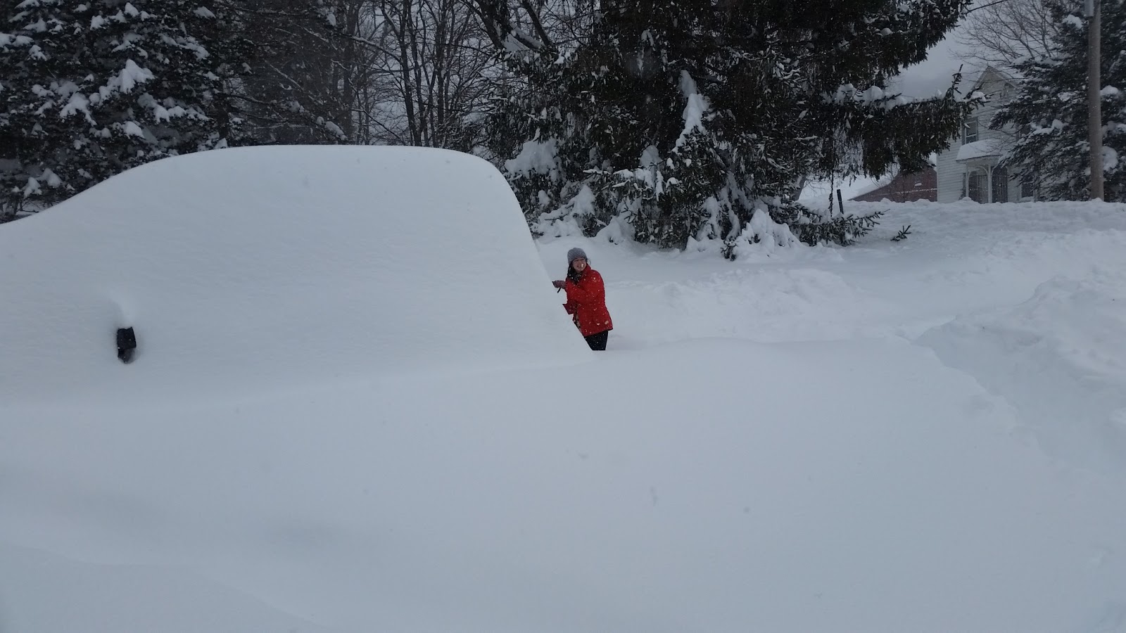 That’s what fell on our house last week. Three feet. It was kind of a lot. This is the Catbird on Wednesday afternoon, when the snow had (mostly) stopped. Granted, she’s short (5′ 3″, I think). The car she is standing next to is a Jeep Grand Cherokee. It’s just about six feet tall–when it isn’t covered with three feet of snow. Needless to say, it was an exhausting couple of days–by the time we were done shovelling the driveway, the piles alongside it were about head high.