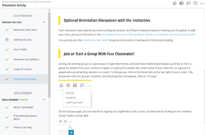 Each week, new content was posted, based on a specific theme, such as “Establishing and exploring identity and community.” Content included usually three video lectures by an author (usually around 20 minutes each); three pieces of required reading, which generally consisted of one fiction, one personal essay or memoir, and one creative nonfiction piece; a menu of optional reads; instructor-led discussion groups related to the week’s topic; and a writing assignment. Assignments would be uploaded, critiques given and received–and credit given.